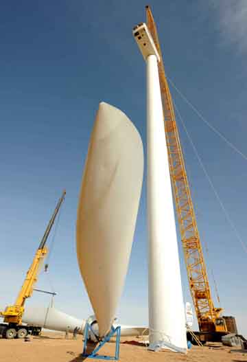 圖為施工人員正在內蒙古巴彥淖爾市烏拉特后旗烏力吉風電場吊裝風機。到2010年,內蒙古風電裝機容量將達到500萬千瓦以上。本報記者:張領
