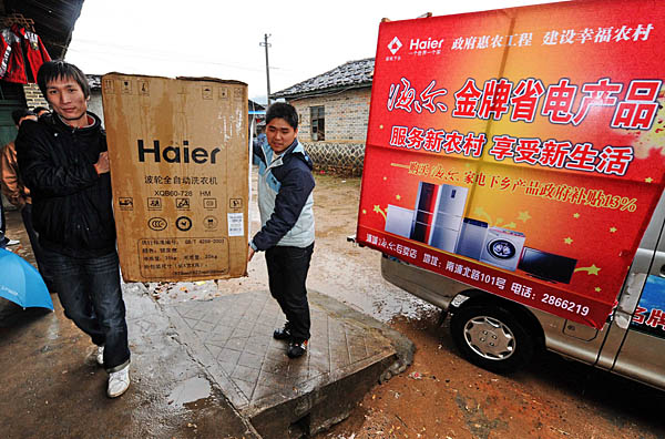 3月4日,福建省浦城縣家電下鄉(xiāng)服務(wù)隊(duì)在仙陽鎮(zhèn)太平村為農(nóng)戶送貨。 當(dāng)日,惠及農(nóng)民的“家電下鄉(xiāng)”在福建閩北山區(qū)浦城縣全面啟動,價格實(shí)惠的家電產(chǎn)品和熱情周到的服務(wù)深受山區(qū)農(nóng)民的歡迎。 | |
