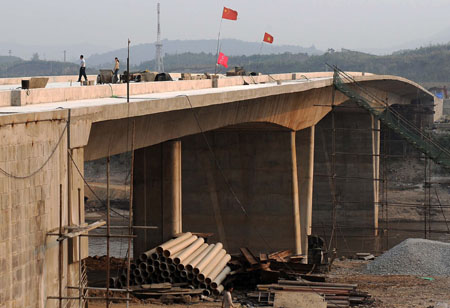 一些工人在地處中越邊境的云南省河口瑤族自治縣加緊建設(shè)中越紅河公路大橋。 |