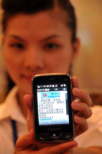 日前,中國電信海南公司3G試商用發(fā)布會在海南省?、三亞、瓊海、儋州四市同時進(jìn)行,標(biāo)志著海南3G業(yè)務(wù)正式啟動,海南首批近百名3G用戶誕生。 自2009年1月7日國家正式發(fā)放3G牌照以來,海南電信經(jīng)過近三個月的努力使海南的3G網(wǎng)絡(luò)基本建成并具備了試商用條件。到目前為止,海南電信3G網(wǎng)絡(luò)共投入建設(shè)資金近六億元,無線寬帶網(wǎng)絡(luò)已覆蓋到全省18個市縣的主要城區(qū),東線高速已全程覆蓋,預(yù)計(jì)到今年5月中旬,3G網(wǎng)絡(luò)將覆蓋海南省所有鄉(xiāng)鎮(zhèn)。圖為工作人員展示手機(jī)3G業(yè)務(wù)中的“海南政要手機(jī)報(bào)”。 |