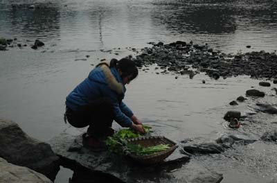 位于秀山縣溶溪鎮(zhèn)的溶溪河畔,附近的一位居民正在河里洗菜。河水雖然是清澈的,但河床是黑的,原因是大量的錳渣沉積在河底。(新華社記者 徐旭忠 攝)