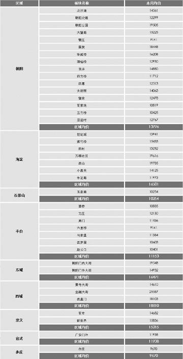 北京市各區(qū)域各板塊均價(單位:元/平方米)