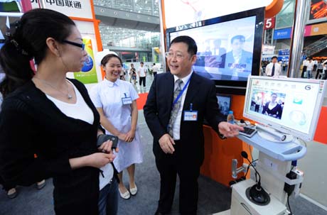 5月14日,一名參展人員(右)向觀(guān)眾介紹可通過(guò)3G網(wǎng)絡(luò)等信息技術(shù)搭建的醫(yī)療行業(yè)移動(dòng)應(yīng)用平臺(tái)。 當(dāng)日,為期4天的2009年天津國(guó)際手機(jī)產(chǎn)業(yè)展覽會(huì)暨論壇在天津?yàn)I海新區(qū)拉開(kāi)帷幕。摩托羅拉、海爾、索愛(ài)等20多家整機(jī)制造商在展覽會(huì)上發(fā)布了新品手機(jī)。國(guó)內(nèi)三大運(yùn)營(yíng)商推出的3G新業(yè)務(wù)成為展覽會(huì)上最大亮點(diǎn)。