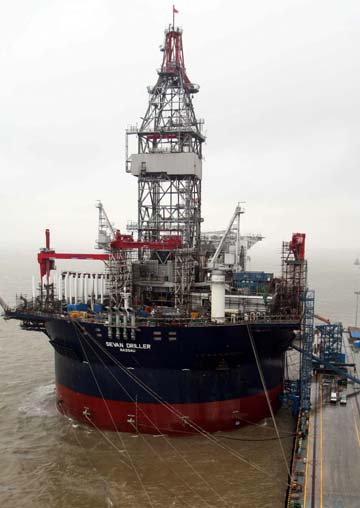 5月20日,巨型鉆井平臺“希望1號”?吭谀贤ㄖ羞h船務碼頭進行最后的施工。 由中遠船務為挪威建造的“希望1號”巨型浮式圓筒型海洋鉆井平臺主船體直徑為84米,可用于一萬英尺深海作業(yè),擁有15萬桶原油的存儲能力。該平臺自2007年5月開工建造,經(jīng)過兩年建設即將完工。