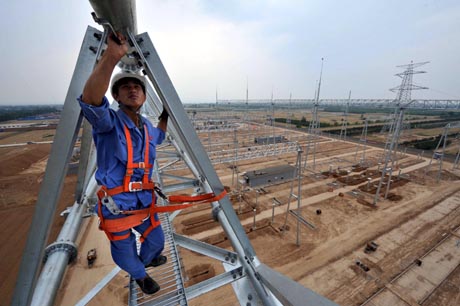 6月16日,在山西稷山500千伏輸變電工程工地上,建設(shè)工人在25米高的500千伏橫梁上作業(yè)。 山西稷山500千伏輸變電工程是山西省電網(wǎng)改造的重點(diǎn)工程之一,工程總投資約11億元。目前,500千伏輸變電工程土建工程基本完成,已進(jìn)入電氣安裝階段,預(yù)計(jì)2009年9月竣工投產(chǎn)。該工程建成投入運(yùn)行后,將大大提高山西省北電南送的能力。