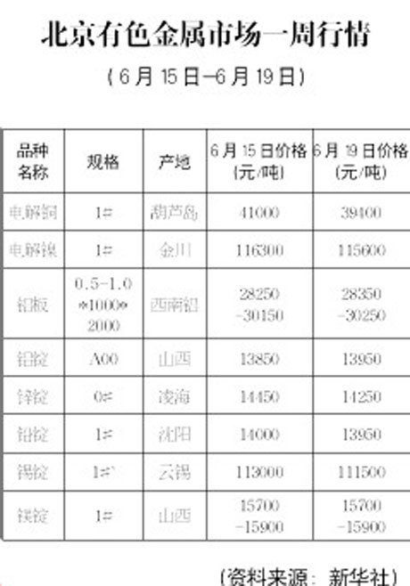 北京有色金屬市場一周行情[06.15-06.19]