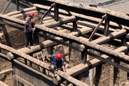 6月29日,工人們在明清古民居群異地遷建工地施工。 近日,河南省焦作市文物局開始對南水北調(diào)中線工程焦作市區(qū)段地上文物西王褚村明清民居建筑群進行整體異地遷建。西王褚村明清民居建筑群是研究焦作地區(qū)明清民居的建筑手法及明末清初焦作工商業(yè)發(fā)展的實物依據(jù)。