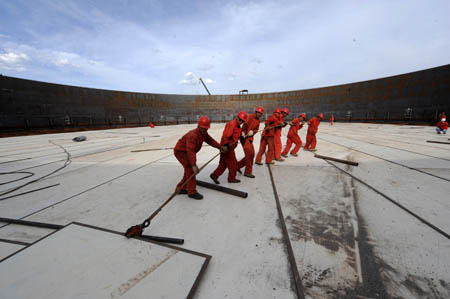 7月13日,新疆油建公司工人在10萬(wàn)立方米大罐內(nèi)拖拽浮艙底板。 位于新疆東部的我國(guó)最大原油儲(chǔ)備庫(kù)設(shè)計(jì)總規(guī)模為800萬(wàn)立方米,目前已有10座10萬(wàn)立方米大罐投入使用,其余在建,施工進(jìn)展順利。原油儲(chǔ)備庫(kù)EPC項(xiàng)目總承包商新疆油建公司采用先進(jìn)的倒裝施工工藝,與傳統(tǒng)的正裝施工工藝相比,可提高工效15%左右,并避免高空作業(yè)。