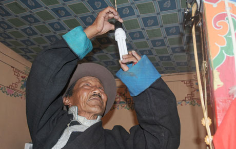 今年是西藏大面積開展節(jié)能燈推廣使用工作的第一年。有關(guān)部門計(jì)劃在年內(nèi)推廣使用60萬只節(jié)能燈,按每天使用3.5小時計(jì)算,日節(jié)電量可達(dá)10萬千瓦時,相當(dāng)于彌補(bǔ)藏中地區(qū)1/4的用電缺口,將極大緩解西藏地區(qū)電力供應(yīng)緊張的局面。圖為拉薩市納金鄉(xiāng)居民達(dá)嘎在自己家里換裝節(jié)能燈。本報(bào)記者涂洪長