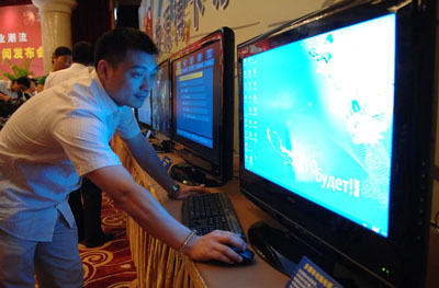 日前,數(shù)源科技公司發(fā)布搏卡系列數(shù)字電視,在網(wǎng)絡(luò)環(huán)境下可通過更換不同的功能卡,實現(xiàn)數(shù)字電視、電腦、多媒體播放器等功能的切換。圖為數(shù)源科技公司開發(fā)部負責人在展示利用電視屏幕上網(wǎng)沖浪。