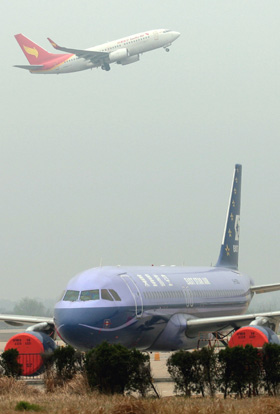 2009年3月27日,在武漢天河國際機(jī)場,一架民營祥鵬航空的航班從已停航13天的東星航空的飛機(jī)上空飛過。周國強(qiáng)