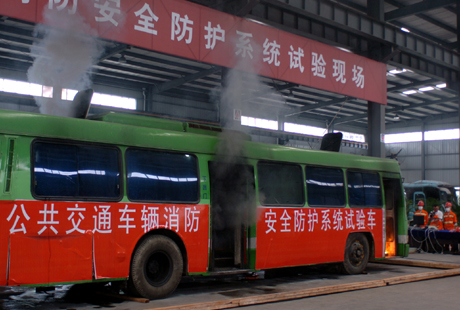“防火公交車”通過專家鑒定。由公安部消防局、四川省科技廳等單位的專家組成的鑒定委員會認(rèn)為,這項(xiàng)科技成果具有高效、環(huán)保、經(jīng)濟(jì)的特點(diǎn),達(dá)到國內(nèi)先進(jìn)水平,具有較好的應(yīng)用推廣前景。圖為9月3日在試驗(yàn)現(xiàn)場,“公共交通車輛消防安全防護(hù)系統(tǒng)”在3秒內(nèi)啟動,并在10秒內(nèi)控制了火勢。