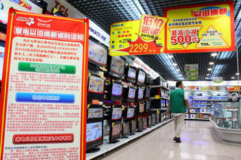 日前,天津市全面展開家電以舊換新工作。據(jù)天津市商務委有關(guān)負責人介紹,家電銷售企業(yè)和回收企業(yè)已經(jīng)通過招標方式確定向社會公布,消費者可在交售舊家電購買新家電時享受家電補貼。此次列入家電以舊換新補貼產(chǎn)品范圍的品種有電視機、電冰箱,洗衣機、空調(diào)、電腦。圖為天津一家電賣場在顯著位置擺放家電以舊換新宣傳展板。 新華社發(fā)