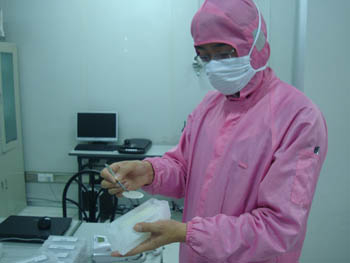 浪潮華光公司科技人員向記者展示外延片。據(jù)介紹,這一塊大約直徑2厘米的外延片,可分離出6萬個LED發(fā)光體,是LED產(chǎn)業(yè)的上游主導(dǎo)產(chǎn)品。本報記者呂福明/攝 |