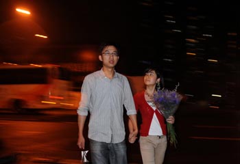圖為5月15日晚,逛完“人居展”后盧俏(右)手持蔣新偉花10元錢買的一把干花走在杭州市區(qū)一條街道上。新華社記者 韓傳號(hào) 攝