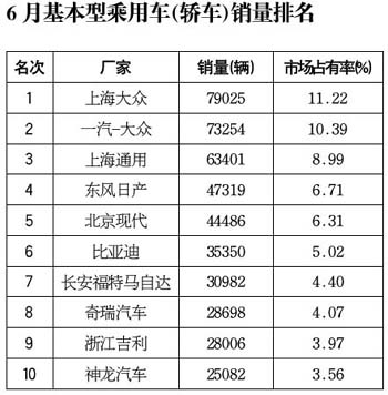 6月,基本型乘用車(轎車)銷售704884輛,環(huán)比下降2.11%,同比增長10.04%。從6月的統(tǒng)計(jì)數(shù)據(jù)看,轎車市場“高開低走”的趨勢愈發(fā)明顯,預(yù)計(jì)7月份轎車增速還將進(jìn)一步下滑。 從6月份的銷量情況來看,排名前十位的企業(yè)共銷售455603輛,占轎車銷售總量的64.64%。從排名情況看,上海大眾由上月的第三位升為第一位,主要緣于朗逸的旺銷,6月銷售2.15萬輛;而上海通用卻由上月的第一位降為第三位,與凱越的銷售不佳有很大關(guān)系。保持排名不變的只有一汽-大眾一家,其余均有變化,北京現(xiàn)代、比亞迪、奇瑞汽車、浙江吉利、神龍汽車均下降了一位,東風(fēng)日產(chǎn)上升了兩位,而上月墊底的長安福特馬自達(dá)上升到第七位,由于?怂6月銷售1.43萬輛,較上月銷量有一定提高。 6月銷量排名前十位的轎車品牌依次是:朗逸、捷達(dá)、悅動、桑塔納、新寶來、F3、駿捷、夏利、?怂购蛣P越。從月度排名來看,朗逸首次位居第一,與上月相比,F(xiàn)3和凱越排名明顯下滑。