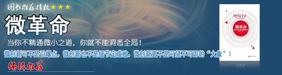誰(shuí)最應(yīng)該成為“微殺手”? 在人類(lèi)社會(huì)的商業(yè)競(jìng)爭(zhēng)中,要想成為出奇制勝的“微殺手”靠什么?當(dāng)然要靠“微創(chuàng)新”了!拔(chuàng)新”與傳統(tǒng)的創(chuàng)新有何不同?更難還是更容易?有哪些規(guī)律和法則?這種“微創(chuàng)新”是否真的會(huì)引爆一場(chǎng)互聯(lián)網(wǎng)時(shí)代的“微革命”?對(duì)于所有類(lèi)似問(wèn)題,《微革命》一書(shū)都進(jìn)行了有血有肉、令人信服且激蕩人心的回答。而我與這本書(shū)發(fā)生的“化學(xué)反應(yīng)”,則延伸到了更為廣闊復(fù)雜的社會(huì)生活、人文傳統(tǒng)等領(lǐng)域…[詳細(xì)] |