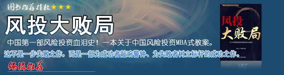 | 看完風(fēng)投大敗局,對(duì)風(fēng)投歷史與現(xiàn)狀有了清楚的認(rèn)識(shí)。任何行業(yè),都有成功與失敗。成功的經(jīng)驗(yàn)?zāi)芄奈枞,但失敗的?jīng)驗(yàn)更能讓人進(jìn)步。讀風(fēng)投大敗局,更能讓我們了解風(fēng)投這個(gè)行業(yè)。 |