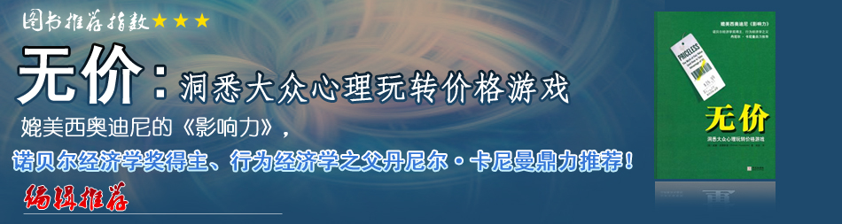 一部精彩而有趣的著作,作者透過(guò)紛繁復(fù)雜的價(jià)格現(xiàn)象,向我們揭示了看似簡(jiǎn)單的價(jià)格背后所包含的精密且復(fù)雜的機(jī)制。正如行為經(jīng)濟(jì)學(xué)所倡導(dǎo),作者采取嶄新的研究手段,將其它社會(huì)科學(xué)學(xué)科的研究成果引用到價(jià)格研究中來(lái),實(shí)現(xiàn)了多視角對(duì)個(gè)體決策因素的度量!稛o(wú)價(jià)》將帶你打開(kāi)價(jià)格領(lǐng)域的密碼,回歸到人的層面來(lái)解讀價(jià)格現(xiàn)象。 |