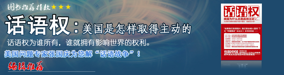 | 收到一本新書,書名很醒目——《話語權(quán)》,作者張國慶是中國社科院美國研究所的國際問題專家!对捳Z權(quán)》這本書主要內(nèi)容說的是美國社會(huì)如何利用“話語權(quán)”來影響中國、誤導(dǎo)中國、鉗制中國、戰(zhàn)勝中國。很寬的書腰上赫然寫著這樣的文字:“在宣傳上花1美元就等于在國防上花5美元”。因此,“話語權(quán)”等于是一場(chǎng)長期而復(fù)雜的“宣傳戰(zhàn)”。張國慶先生的這本書我還沒來得及看完,但是,他很清晰地提出了“話語權(quán)”這個(gè)非常重要的問題,他讓我們意識(shí)到,中國與美國之間的這場(chǎng)“話語權(quán)”較量,至少在目前看來,中國一直處于下風(fēng),近幾十年來,中國在這個(gè)問題上,始終不是美國的對(duì)手。有這樣一個(gè)意識(shí),我覺得是一個(gè)巨大的進(jìn)步…[詳細(xì)] |