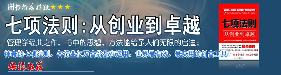 | 在《七項法則》中,印象最深刻的是“逆風險營銷”,這個思路讓我對目前正困惑的一個項目,有豁然開朗的感覺。它能指導(dǎo)人如何更好地創(chuàng)業(yè)、管理公司、更好地工作。 |