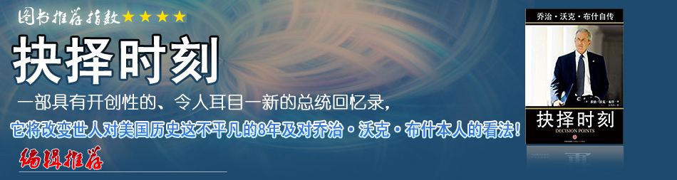 美國(guó)前總統(tǒng)小布什回憶錄《抉擇時(shí)刻》自2010年11月在美國(guó)上市以來(lái)銷(xiāo)售火爆,面市一周賣(mài)出77萬(wàn)多冊(cè)。近日,中文版推出。這本書(shū)試圖重建布什的聲譽(yù),提供了他對(duì)其總統(tǒng)任期內(nèi)最具爭(zhēng)議性事件的解釋?zhuān)ㄒ晾、阿富汗?zhàn)爭(zhēng)、卡特里娜颶風(fēng)、華爾街金融風(fēng)暴、關(guān)塔那摩虐俘事件!購(gòu)買(mǎi)