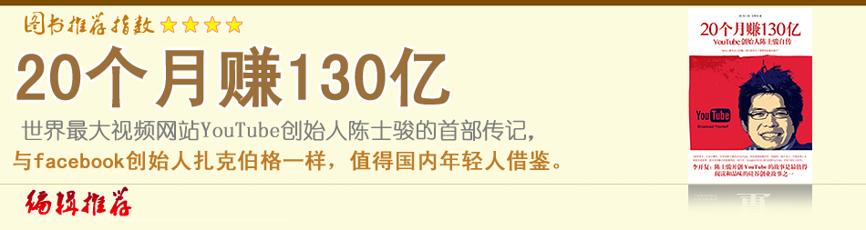 | YouTube聯(lián)合創(chuàng)始人陳士駿在書中以樸實(shí)親切的口吻講述了他的人生經(jīng)歷,以及對學(xué)業(yè)、事業(yè)、夢想、財富、生死等的種種感悟。值得一看。 |