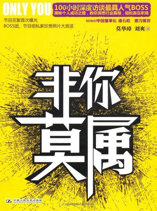 由國內(nèi)知名的財經(jīng)圖書出版商湛廬文化策劃、中國人民大學(xué)出版社出版的同名新書《非你莫屬》,是節(jié)目內(nèi)容的延伸與深化。書作者分別完成了與《非你莫屬》節(jié)目十位嘉賓(BOSS)的深度對話,不僅敘述了十位商界精英的個人成長歷程、創(chuàng)業(yè)史或職場打拼故事,而且還引導(dǎo)受訪者闡述了對新入職者、職場瓶頸期、創(chuàng)業(yè)者若干常見疑難的看法。