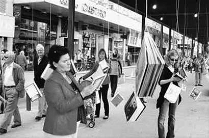 圖為西班牙馬德里街頭的一個(gè)圖書展示長(zhǎng)廊。人們可隨意翻閱掛在長(zhǎng)廊里的圖書。