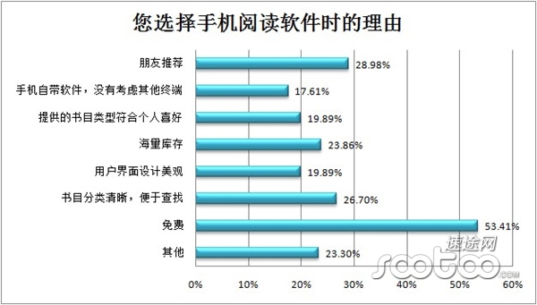 既然有這么多手機閱讀軟件,用戶在選擇手機軟件時的影響因素又是什么呢?上面表格列舉了很多因素,朋友推薦的因素占比為28.98%,免費因素是一個主要的因素,53.41%的用戶在選擇手機閱讀軟件時會看重免費因素,書目分類清晰、便于查找、提供的書目類型符合個人喜好、海量庫存等因素也在影響著用戶對于讀書軟件的選擇。