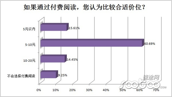 如果進行付費閱讀,用戶能接受的價位5-10元最多,比例為60.69%;15.61%的用戶只能接收5元以內(nèi)的付費閱讀,也有9.25%的用戶不會接收付費閱讀。看來付費閱讀的道路很難走,相關(guān)企業(yè)還需另謀出路。