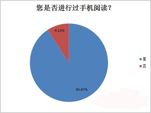 用戶是否進行過手機閱讀,通過調(diào)查我們發(fā)現(xiàn)大多數(shù)人都進行過手機閱讀,90.87%的手機用戶曾經(jīng)有過手機閱讀的行為,且有很多用戶目前仍在進行手機閱讀。