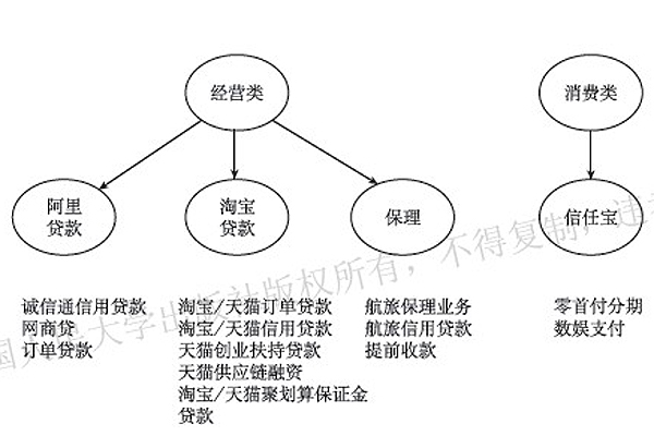阿里小貸2010年6月由阿里巴巴和復(fù)星、萬(wàn)向、銀泰等共同出資成立,是國(guó)內(nèi)第一家服務(wù)于電子商務(wù)領(lǐng)域小微企業(yè)融資需求的小額貸款公司。阿里小貸以阿里巴巴、淘寶、天貓平臺(tái)內(nèi)積累的海量交易數(shù)據(jù)為依據(jù)放貸(主要貸款類型見(jiàn)圖7—7),無(wú)須抵押物,無(wú)須擔(dān)保,貸款金額通常在100萬(wàn)元以內(nèi)。所有貸款流程都在網(wǎng)上完成,通過(guò)支付寶發(fā)放,基本不涉及線下審核,最短放貸時(shí)間僅需3分鐘。信譽(yù)度較高的客戶還可以通過(guò)申請(qǐng)和人工審核獲得超額貸款,金額在1000萬(wàn)元以內(nèi)。