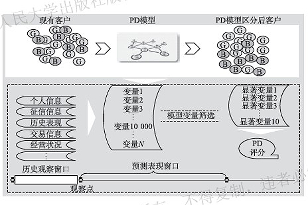 阿里小貸使用違約風(fēng)險(xiǎn)模型對(duì)網(wǎng)商進(jìn)行信用評(píng)分。該模型分三個(gè)步驟(見(jiàn)圖7—10):第一步,歸集現(xiàn)有客戶的個(gè)人信息、征信信息、歷史表現(xiàn)、交易信息和經(jīng)營(yíng)狀況等信息。第二步,根據(jù)歸集的信息,篩選出對(duì)信用狀況有顯著影響的變量,建立PD模型。第三步,根據(jù)PD評(píng)分對(duì)潛在客戶進(jìn)行分類,區(qū)分出信用好和信用不好的客戶。通過(guò)該模型,網(wǎng)商在阿里巴巴生態(tài)系統(tǒng)中的信用記錄、交易、投訴糾紛情況等百余項(xiàng)信息得到了充分運(yùn)用,最終作為貸款評(píng)審依據(jù),解決了傳統(tǒng)銀行對(duì)中小企業(yè)(和個(gè)人)貸款存在的信息不對(duì)稱、流程復(fù)雜等問(wèn)題。