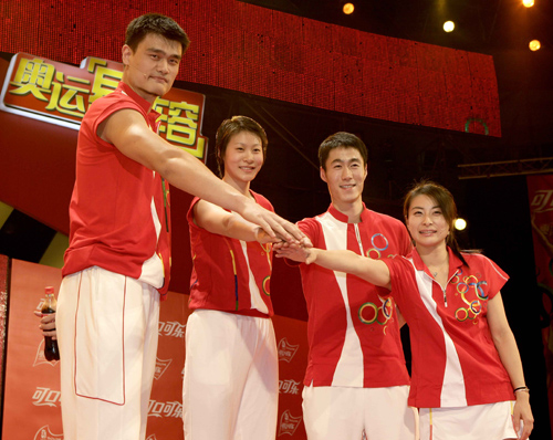 北京奧運(yùn)會(huì)火炬接力全球合作伙伴可口可樂公司日前在北京宣布:2008北京奧運(yùn)會(huì)火炬手提名活動(dòng)在全國正式啟動(dòng)。圖為中國籃球運(yùn)動(dòng)員姚明、排球運(yùn)動(dòng)員趙蕊蕊、乒乓球運(yùn)動(dòng)員王勵(lì)勤和跳水運(yùn)動(dòng)員郭晶晶(從左至右)在北京舉行的“奧運(yùn)星陣容”揭幕儀式上。