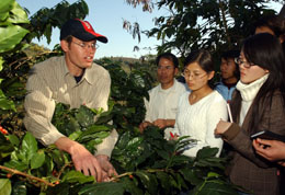 揚帆工程走進云南,旨在幫助全國大學(xué)畢業(yè)生成功就業(yè)?Х确N植專家鄔特(左一)在為云南農(nóng)業(yè)大學(xué)應(yīng)屆畢業(yè)生介紹小粒種咖啡種植技術(shù)。新華社記者:王呈選