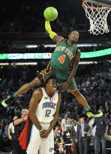 | 羅賓遜(上)與霍華德 | 今年NBA全明星賽的最有價值球員(MVP)獎杯頒給了“OK”組合——“大鯊魚”奧尼爾和科比·布萊恩特這對昔日洛杉磯湖人隊的歡喜冤家。 在這場西部明星隊以146:119大勝東部明星隊的比賽中,科比得到了全場最高的27分,奧尼爾只砍下了17分,但這位15次入選全明星賽(全聯(lián)盟排名第二)的大塊頭,仗著比賽是在自己母隊的主場進行,儼然成為場上最為搶鏡的主角。奔著“四張”去的奧胖還是那副“搞笑大師”的做派,以夸張、詼諧的表演成為全場最能愉悅觀眾的球員。結果,經(jīng)球迷和媒體投票,奧尼爾和科比一起當選MVP。 劉德華前幾年拍了一部《大塊頭有大智慧》的電影,而奧尼爾幾乎在每次全明星賽上都告訴你什么是大塊頭有大幽默。比如2007年拉著“小皇帝”詹姆斯一起跳的那段相當專業(yè)的大屁股街舞,再比如他總是能把那雙球鞋弄出花樣(改裝成遙控車或是老虎機)。沒有奧胖的全明星賽是不可想象的,去年新奧爾良缺了這個“開心果”,很多人都感到不爽。 與“鯊魚”一同閃耀NBA全明星周末的是小飛人內(nèi)特·羅賓遜(紐約尼克斯隊)。后者憑借1.75米的身高,在扣籃大賽中擊敗了海拔2.11米、披著“超人”斗篷的德懷特·霍華德,一舉成為“扣籃王”。這是小飛人繼2006年之后又一次拿到該獎項,此前只有“飛人”喬丹等四人先后獲得過兩屆“扣籃王”稱號。 當然,羅賓遜要好好感謝一下甘為陪襯的霍華德。前者在決賽中一身綠裝,有意讓人聯(lián)想起漫畫中專門抑制“超人”能力的元素“氪”,還事先安排披著“超人”斗篷的霍華德作為人梯。后者沒有考慮輸贏,而是將全明星周末的娛樂性發(fā)揮到極限,不假思索地就答應下來,于是兩人上演了一幕“小個子飛躍超人”的好戲。雖然今年的全明星“票王”霍華德沒能舉起扣籃大賽的獎杯,但其天生的搞笑細胞和娛樂大眾的良好意識,已經(jīng)得到了NBA內(nèi)外的一致認可。有媒體評論說,謝天謝地,“大鯊魚”奧尼爾在全明星周末的耍寶角色終于后繼有人了。 和羅賓遜一起“飛”起來的,是俄羅斯女子撐桿跳高奧運冠軍伊辛巴耶娃。2月15日,她在烏克蘭舉行的一項年度大賽中將橫桿的位置提升到5米的高度。伊娃在第二跳時躍過了這一高度,奉獻了一項新的世界紀錄。 飛得高的是飛人,跑得快的也是飛人。 牙買加飛人博爾特雖然不久前被指在酒吧大跳“臟舞”,但2月14日情人節(jié)那天的比賽結果表明:北京奧運會的男子百米冠軍并沒有荒廢武功。在牙買加首都金斯敦舉行的2009年坎伯當精英賽上,博爾特參加了男子400米比賽,以不可動搖的優(yōu)勢獲得了冠軍。博爾特的成績并不算好,只有46秒35,遠遠落后于這個項目的世界紀錄43秒18(1999年由美國人邁克爾·約翰遜創(chuàng)造),但其象征意義卻很大:這個目前世界上跑得最快的人(奧運會100米和200米雙料冠軍),終于要向男子400米發(fā)起總攻。 回頭來看,博爾特的酒吧丑聞只是一個小插曲,盡管紙醉金迷的時光很誘人,但博爾特并沒陷入其中而樂不思蜀。其經(jīng)紀人希姆斯曾披露,盡管新年前后“閃電”博爾特的社交活動比以往要多,但他并沒有放松冬訓,只不過放緩了一下訓練進度。希姆斯的話還可以這樣理解,博爾特是個聰明又本分的運動員,既可在放松的時候玩到忘乎所以、不顧形象,又知道什么時候返回訓練場,向著更高的目標發(fā)起挑戰(zhàn)。身為公眾人物,博爾特狂泡酒吧、濫秀舞技,估計當不上道德楷模,但至少守住了一個靠身體吃飯、憑成績拿獎金的職業(yè)運動員的底線,這可比國內(nèi)一些足球運動員場下胡鬧場上腿軟強得多。博爾特的教練邁爾斯也替弟子高興,他希望博爾特能在2010年實現(xiàn)“大滿貫”,把男子100米、200米和400米三項世界紀錄攬入懷中。 替弟子高興的還有孫海平。中國的“翔飛人”在美國接受手術后,其傷口恢復得相當好,雖然再次騰飛還提不上日程,但距離人們的希望又近了一些。按計劃,劉翔將在本月底或是下月初回國,到時候,他一定要在眾目睽睽下稱重,看看到底是胖了還是瘦了。似乎是在春節(jié)前,有媒體誤傳翔飛人增重30斤,“雷”倒了國內(nèi)一干“粉絲”。有人就此揶揄說,如果“翔飛人”胖得沒了樣,那一定是在養(yǎng)病期間不小心多喝了幾箱其代言的某種碳酸飲品,就是顏色黑黑的、味道有點兒苦的那種。