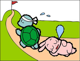 股市也類似龜兔賽跑。短線高手就如兔子一樣,憑借先天的優(yōu)勢,開始的時候,他們跑得很快,所以遠跑贏大盤。但是因為跑得快,所以累得也快;而當他很累的時候,卻又比較自負,過于得意洋洋,自然免不了麻痹大意,不小心一失誤,如買中一個陷阱重重的爛股,就像兔子一樣睡懶覺,當他們被套的時候,時間也是過得飛快,就會白白錯失牛市的大好時機,最后他們除了可能遠跑輸大盤之外,還可能全盤皆輸。而那些長線投資者,因為不太急功近利,所以不緊不慢,就像烏龜一樣,慢慢爬行,優(yōu)哉游哉,以逸待勞,所以跑得相對比較輕松,沒有多少壓力,到最后在慢慢爬行中,卻不知不覺就跑贏了時間,遠遠跑贏了大盤,成了最后的大贏家。