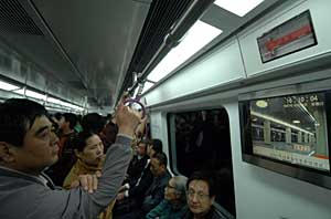 | 10月7日,北京地鐵5號(hào)線下午2:00正式售票開(kāi)通試運(yùn)營(yíng),軌道交通全路網(wǎng)票價(jià)2元.北京市民可以乘坐地鐵直接從城南豐臺(tái)區(qū)的宋家莊到達(dá)城北昌平區(qū)的天通苑。圖為乘客正在看5號(hào)線地鐵車(chē)?yán)锏娘@示器。新華社記者