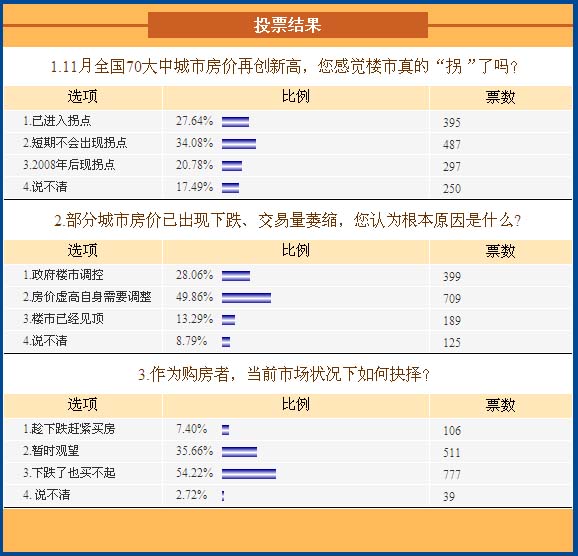 記者了解到,有關(guān)樓市是否出現(xiàn)拐點(diǎn)的爭論絕非偶然。最近一段時間,關(guān)于廣州、深圳樓市降價、開始促銷的消息吸引了眾人的眼球,北京、上海樓市“有價無市”的消息也頻頻見諸報端,成了這場爭論的直接“導(dǎo)火索”。 在北京東四環(huán)某售樓處,前來看房的張小姐對記者說:“最近一段時間,有關(guān)北京房價出現(xiàn)松動的報道多了,我過來了解一下情況。唉,看了幾個樓盤,價格還是比前一段時間高呀!” 對于未來的房價走勢,張小姐說,深圳都已經(jīng)降價了,我覺得北京也挺不了多久了,“拐點(diǎn)”應(yīng)該出現(xiàn)了。我決定再觀望一段時間等房價下調(diào)了,再考慮購房。 記者發(fā)現(xiàn),與張小姐的觀點(diǎn)相同,多數(shù)接受網(wǎng)絡(luò)調(diào)查的消費(fèi)者也認(rèn)為樓市“拐點(diǎn)”來臨。根據(jù)新浪網(wǎng)進(jìn)行的“您認(rèn)為樓市是否出現(xiàn)拐點(diǎn)”調(diào)查顯示:在總共1678人參加的調(diào)查中,有61.08%的被調(diào)查者認(rèn)為樓市“拐點(diǎn)”已經(jīng)來臨;27.23%的被調(diào)查者認(rèn)為現(xiàn)在談拐點(diǎn)為時尚早;另有11.68%的人認(rèn)為不確定。 對于您認(rèn)為當(dāng)前的樓市拐點(diǎn)是什么,61.44%的被調(diào)查者認(rèn)為是房價由快速上漲到理性調(diào)整;27.41%的被調(diào)查者認(rèn)為是房價由上漲到下跌;11.14%的人認(rèn)為是由供不應(yīng)求到供過于求。關(guān)于當(dāng)前形勢是否會影響您的置業(yè)計劃,72.57%的被調(diào)查者表示會推遲買房;18.63%被調(diào)查者表示會按原計劃買房;另有8.8%的人表示不確定。 盡管多數(shù)被調(diào)查者認(rèn)為樓市“拐點(diǎn)”來臨,但國家發(fā)改委、國家統(tǒng)計局12月20日發(fā)布的全國70個大中城市房價顯示,“漲聲”依然是主旋律。2007年11月,全國70個大中城市房屋銷售價格同比上漲10.5%,新建商品住房銷售價格同比上漲12.2%。分地區(qū)看,同比漲幅較高的主要城市包括:烏魯木齊21.1%、寧波18.8%、北海18.3%、北京17.4%、長沙17.2%、深圳17.0%、杭州16.7%和南寧16.1%等,顯示房價上漲仍然明顯。