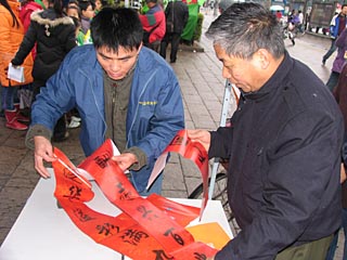 | 1月26日,福建省環(huán)保志愿者協(xié)會(huì)和省楹聯(lián)學(xué)會(huì)在福州市五一廣場(chǎng)組織“舊報(bào)紙換春聯(lián)、環(huán)保購(gòu)物袋”活動(dòng)。新華社記者 來(lái)建強(qiáng)