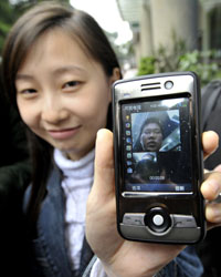 4月1日,廣州市民丁梅在展示剛開戶的3G手機,她正在與另一位3G手機用戶進行可視通話。新華社記者:劉大偉