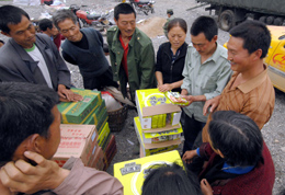 米22斤,面8斤,礦泉水2瓶。這是5月25日晨,四川省綿陽市平武縣南壩鎮(zhèn)冒水頭村婦女文小蕓排隊領(lǐng)到的救災(zāi)物資!凹由献约矣械,我們不渴不餓!蔽男∈|說,“就是睡得有點擠,要是再能多領(lǐng)點彩條布搭帳篷就更好了! 遠(yuǎn)遠(yuǎn)望去,南壩鎮(zhèn)的河灘就像一個巨大的露天倉庫。成堆的礦泉水、方便面、糧油和被褥、帳篷等物資分類堆放一邊,顯得整齊有序。另一邊,是南壩鎮(zhèn)各個鄉(xiāng)村趕來領(lǐng)取救災(zāi)物資的受災(zāi)群眾,他們大部分背著背簍;個別通路的村,則開上了拖拉機和摩托車。 在現(xiàn)場負(fù)責(zé)分發(fā)物資的南壩鎮(zhèn)黨委副書記王青龍說,現(xiàn)在的救災(zāi)物資由平武縣抗震救災(zāi)指揮部統(tǒng)一調(diào)撥。由縣分發(fā)到鎮(zhèn),鎮(zhèn)分發(fā)到各鄉(xiāng)村,鄉(xiāng)村再分發(fā)到合作社和村民小組。 記者看到,物資發(fā)放必須由村委會主任或村黨支部書記去登記本村人口總數(shù),再由專人領(lǐng)到物資堆放點領(lǐng)取,由村負(fù)責(zé)人再進(jìn)一步登記、分發(fā)到每一戶村民手中。 王青龍說,南壩鎮(zhèn)受災(zāi)群眾估算有2.6萬多人,從災(zāi)情發(fā)生至今,平均每天每人領(lǐng)到1斤大米,每戶1箱方便面、1盒罐頭,礦泉水、牛奶4戶1箱,大村發(fā)放帳篷30個,小村發(fā)放帳篷20個,此外,奶粉等物資專向3歲以下嬰幼兒發(fā)放。 正在登記發(fā)放物資的冒水頭村村委會主任文樹成告訴記者,他們村有200戶710多人,領(lǐng)到大米700斤,被褥、方便面、礦泉水和食鹽、蔬菜、牛奶若干!皽仫柌怀蓡栴}!蔽臉涑烧f。 記者從平武縣委宣傳部了解到,截至5月24日,平武縣抗震救災(zāi)指揮部累計接收方便食品63490件,向平武、南壩、平同和響巖四個點發(fā)放方便食品55692件;帳篷4311頂,發(fā)放3527頂;接受捐贈糧食797.97噸,發(fā)放276.59噸。 坐在拖拉機上照看半車方便面的黨家溝村村民蔣燕說,“目前村里不缺藥,小孩的奶粉還缺。但我們在這么大的地震后還能有吃有住,真的感謝黨和政府,感謝幫助我們的所有人!