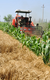 小型收割機正在青銅峽市一塊麥田里作業(yè)。今年寧夏回族自治區(qū)夏糧喜獲豐收,預(yù)計總產(chǎn)可達6.6億公斤,比去年增產(chǎn)0.5億公斤,增幅8%,其中小麥總產(chǎn)有望達到6.43億公斤。新華社記者:馬俊