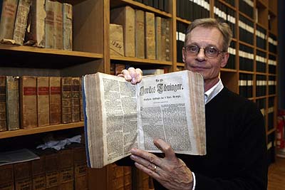 15日,在瑞典斯德哥爾摩,《國內(nèi)郵報》前主編展示1796年4月6日發(fā)行的報紙。瑞典《國內(nèi)郵報》發(fā)行了362年后在2007年舊貌換新顏,傳統(tǒng)的報紙發(fā)行退出歷史舞臺,取而代之的是新興的網(wǎng)絡(luò)媒體形式!秶鴥(nèi)郵報》由瑞典女王克里斯蒂娜于1645年創(chuàng)立,是世界上發(fā)行時間最長的報紙。 |
