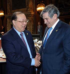 9日,中國財政部長金人慶(左一)出席在德國西部城市埃森舉行的西方七國集團(tuán)與中國、印度、巴西、南非、俄羅斯、墨西哥財長對話會。新華社記者 吳曉凌