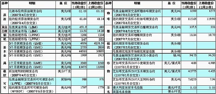當(dāng)周國際油價連續(xù)多日上漲,但在最后一個交易日小幅回落。影響當(dāng)周國際油價走勢的主要因素包括美國成品油庫存下降、全球股市下跌及美國春季來臨汽油消費量增加等。 從2月24日開始,美國中西部和東北部地區(qū)先后出現(xiàn)暴風(fēng)雪天氣,交易者預(yù)計這將導(dǎo)致取暖油消費量增加。另外,美國能源部2月28日公布的最新石油庫存數(shù)據(jù)顯示,在截至2月23日的一周里,美國的汽油庫存下降了190萬桶,降至2.202億桶,包括取暖油和柴油在內(nèi)的其他成品油庫存也下降了380萬桶,降至1.245億桶。目前,美國成品油庫存低于去年同期水平。再加上美國春季來臨汽油消費量增加以及伊朗核問題等因素影響,國際油價連續(xù)上漲,紐約和倫敦市場油價在3月1日雙雙站上每桶62美元,創(chuàng)下年內(nèi)最高收盤價。 但在最后一個交易日,由于全球一些主要股市繼續(xù)大幅下挫,引發(fā)了投資者對經(jīng)濟前景的擔(dān)憂,這對油市產(chǎn)生了不利影響,并結(jié)束了之前油市的連續(xù)上漲行情。 美國供應(yīng)管理協(xié)會1日發(fā)表的報告顯示,美國制造業(yè)活動指數(shù)2月份為52.3,高于前一個月的49.3。在此利好消息推動下,美元對歐元匯率有所上揚,從而拉低了黃金的期貨價格。其它貴金屬的價格也各有不同程度的下滑。因市場擔(dān)心全球庫存較低,鉛和鎳的價格上揚,鉛價升至1953年開始在倫敦上市交易以來的最高點——每噸1975.15美元,鎳價也升至每噸42200美元的歷史新高。其它基本金屬的價格則紛紛下挫。 據(jù)可可主產(chǎn)國科特迪瓦的出口商預(yù)計,2006年10月至今年3月的可可產(chǎn)量約達91.5萬噸,低于上一年度的94.4萬噸,因此可可的價格上漲。由于主產(chǎn)國越南的咖啡產(chǎn)量過剩,咖啡價格走低。此外,美國市場谷物類價格多數(shù)下滑。