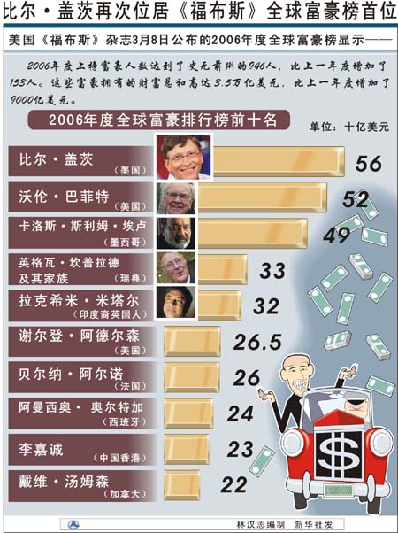 | 美國(guó)《福布斯》雜志近日公布2006年度全球個(gè)人財(cái)富排行榜,羅列了截至2月初個(gè)人資產(chǎn)市值達(dá)到或超過(guò)10億美元的946人。 按照排行榜制作者的說(shuō)法,《福布斯》排行榜不只是個(gè)人財(cái)富的簡(jiǎn)單羅列,同時(shí)也是全球經(jīng)濟(jì)及其變化的曲折反映。而近年來(lái)亞洲經(jīng)濟(jì)的蓬勃向上,也讓財(cái)富榜上涌現(xiàn)出越來(lái)越多的亞洲富豪。