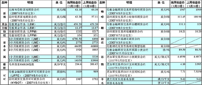 在美國(guó)汽油庫(kù)存持續(xù)下降、煉油廠原油需求增加、美聯(lián)儲(chǔ)決定將聯(lián)邦基金利率保持在5.25%水平不變,以及交易者擔(dān)心中東地區(qū)局勢(shì)更趨緊張等多重因素的共同作用下,當(dāng)周國(guó)際油價(jià)總體呈上升之勢(shì)。 美國(guó)能源部21日公布的數(shù)據(jù)顯示,在截至3月16日的一周里,美國(guó)汽油庫(kù)存下降340萬(wàn)桶,包括柴油和取暖油在內(nèi)的其他成品油庫(kù)存下降170萬(wàn)桶。另外,當(dāng)周美國(guó)煉油廠設(shè)備開工率為86.3%,比前一周有所上升。市場(chǎng)分析人士指出,這顯示在夏季汽油消費(fèi)高峰期到來(lái)之前,美國(guó)煉油廠正在擴(kuò)大生產(chǎn)。當(dāng)日,美聯(lián)儲(chǔ)還決定將聯(lián)邦基金利率保持在5.25%的水平不變,這有利于美國(guó)經(jīng)濟(jì)繼續(xù)保持增長(zhǎng),進(jìn)而有可能使得美國(guó)原油需求繼續(xù)保持旺盛勢(shì)頭,這些因素都推動(dòng)了油價(jià)走高。 此外,伊朗外交部23日證實(shí)于當(dāng)天早晨在海灣扣留了15名英國(guó)海軍人員,交易者擔(dān)心該事件可能導(dǎo)致中東地區(qū)局勢(shì)更趨緊張,這也成為推高油價(jià)的一個(gè)重要因素。 在美元走低和油價(jià)上漲雙重因素的影響下,黃金的期貨價(jià)格上揚(yáng),鉑、鈀等其他貴金屬價(jià)格也跟著走高;窘饘賰r(jià)格則是漲跌互現(xiàn),其中銅價(jià)和錫價(jià)升勢(shì)較猛:受中國(guó)需求增加等因素影響,銅價(jià)升至今年以來(lái)最高點(diǎn)——每噸6865美元;錫價(jià)也因主產(chǎn)地印度尼西亞國(guó)內(nèi)存在的生產(chǎn)問(wèn)題而升至歷史新高——每噸14351美元。 玉米、小麥以及大豆的價(jià)格紛紛上漲,艾倫代爾公司分析師喬·維克托認(rèn)為,由于預(yù)計(jì)需求仍然強(qiáng)勁,玉米和大豆價(jià)格的長(zhǎng)期走勢(shì)依然看漲。因市場(chǎng)擔(dān)憂西非的可可收成可能較低,在投機(jī)性購(gòu)買因素的支撐下,倫敦和紐約兩地可可價(jià)格紛紛升至三年多來(lái)高點(diǎn)。同樣在投機(jī)性購(gòu)買因素的刺激下,咖啡價(jià)格上揚(yáng)。 由于出現(xiàn)不利于橡膠生長(zhǎng)的干燥天氣,再加上日本市場(chǎng)存在抬高價(jià)格的投機(jī)交易,橡膠價(jià)格被推高。