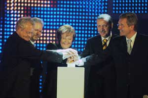 15日,德國(guó)總理默克爾(左三)與土耳其總理埃爾多安(右二)在漢諾威舉行的工業(yè)博覽會(huì)開(kāi)幕式上按下啟動(dòng)激光束的電鈕。新華社記者 吳曉凌